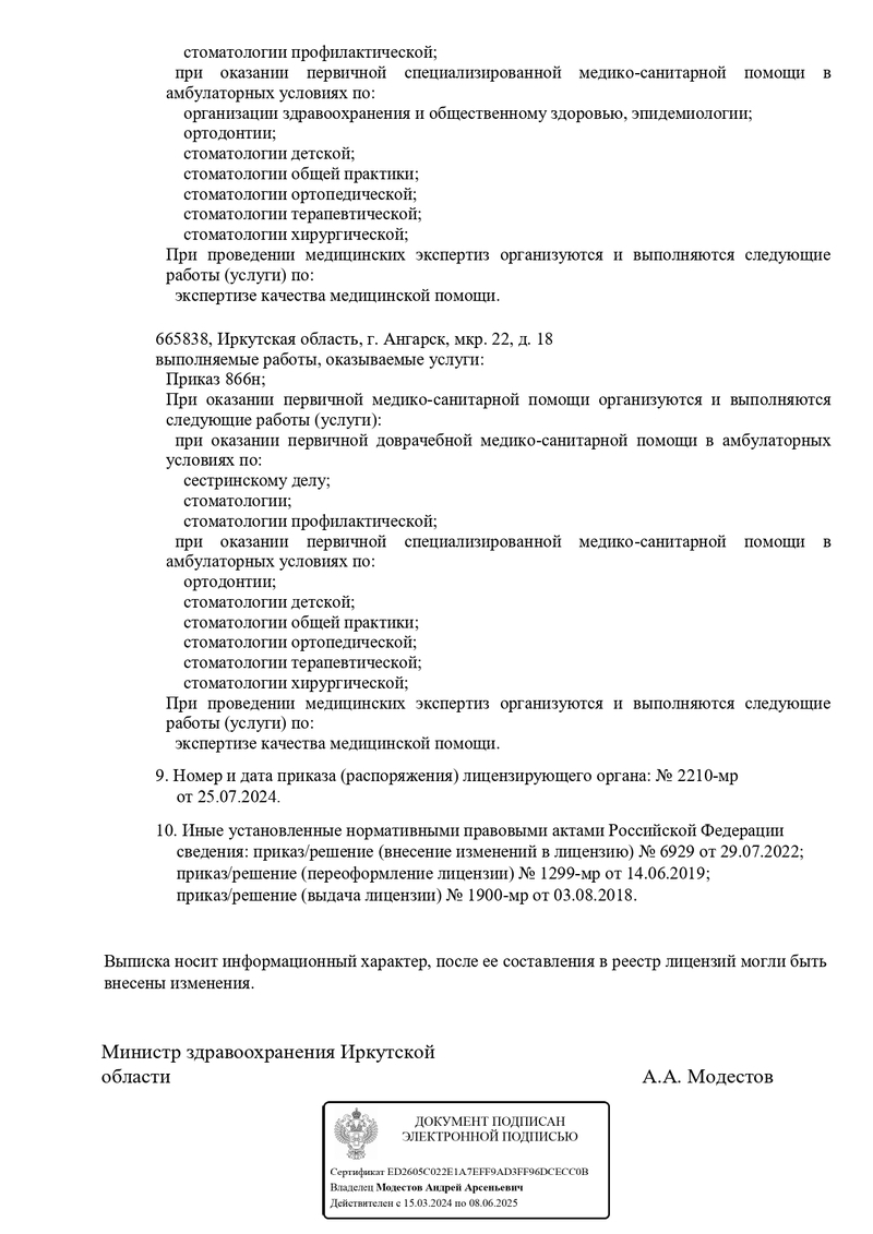 Занимается диагностикой, лечением кариеса и его осложнений, проведением профессиональной гигиены, отбеливанием Zoom, проведением Vector терапии при заболеваниях дёсен.